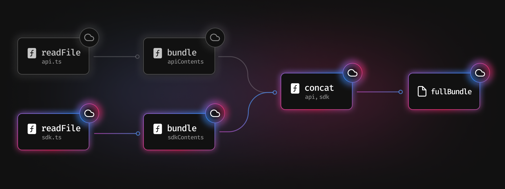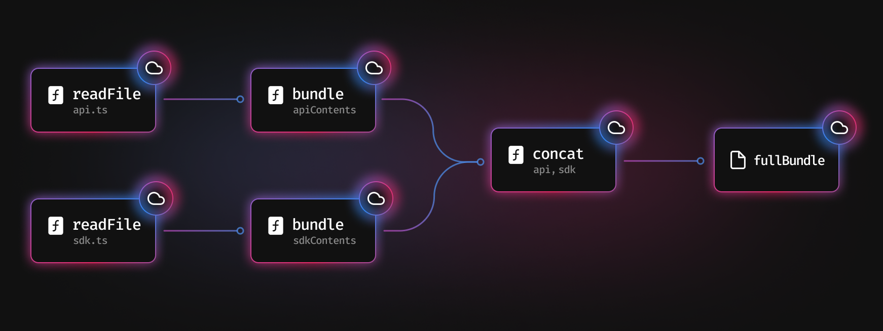 我们首先对两个文件调用 readFile,分别是 api.ts 和 sdk.ts。然后我们 bundle 这些文件,concat 它们,最终得到 fullBundle。所有这些函数调用的结果都会被保存到缓存中,以便以后使用。